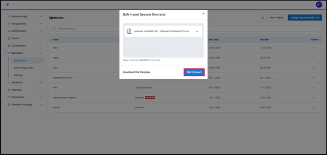 Admins can now import multiple sponsors at once using a CSV file, reducing manual data entry and speeding up onboarding.
