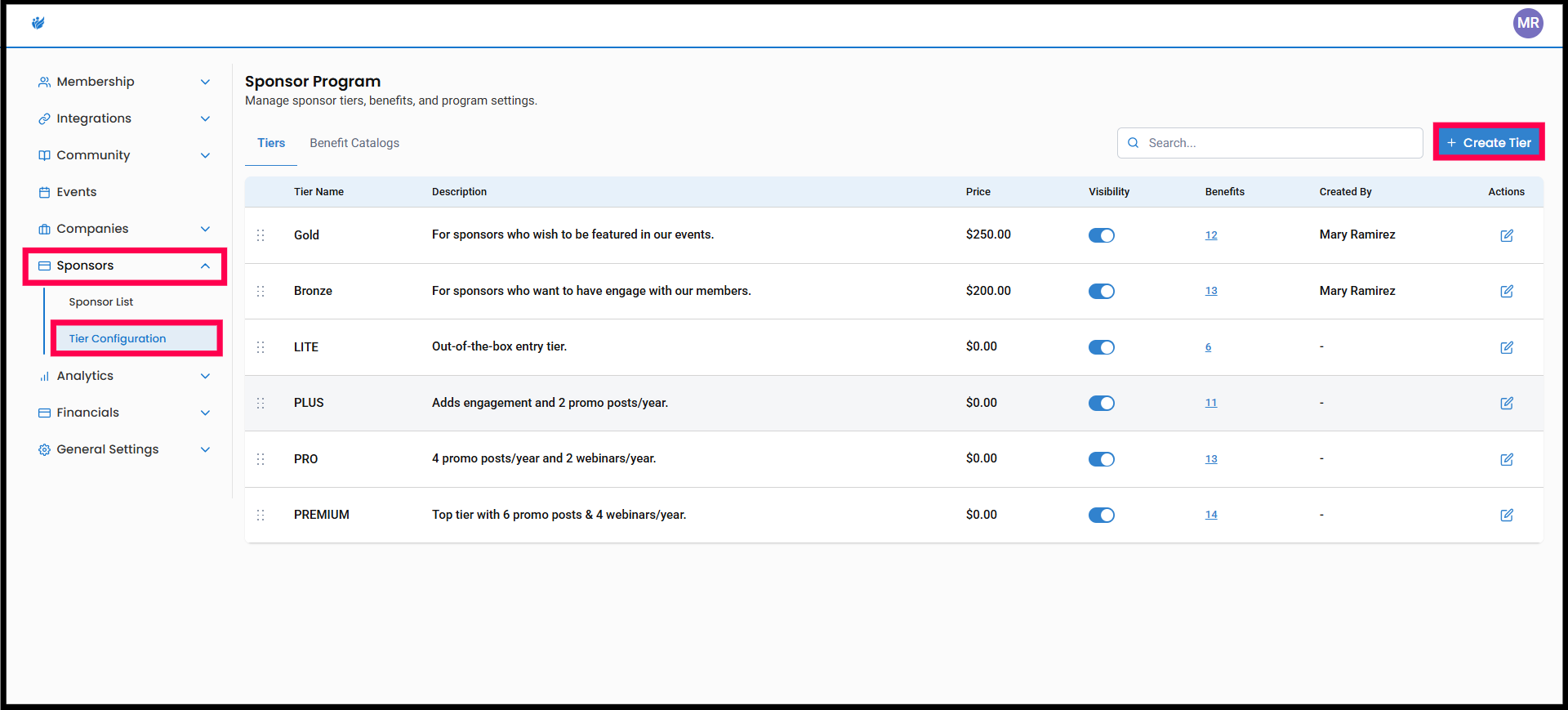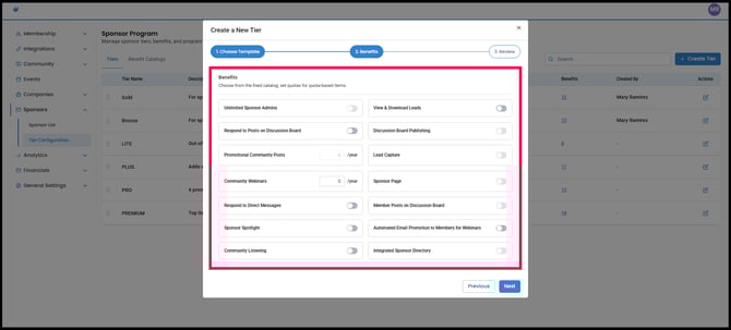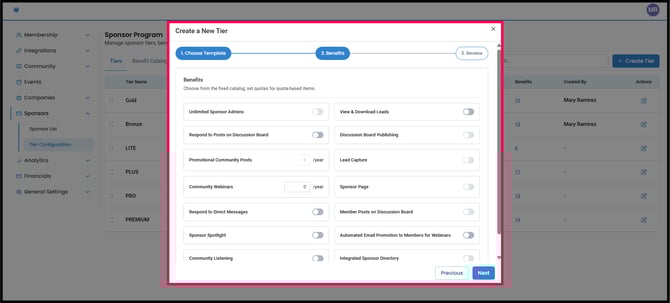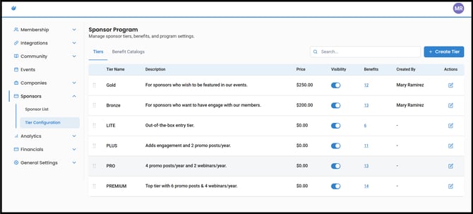 Create custom sponsor tiers based on platform templates