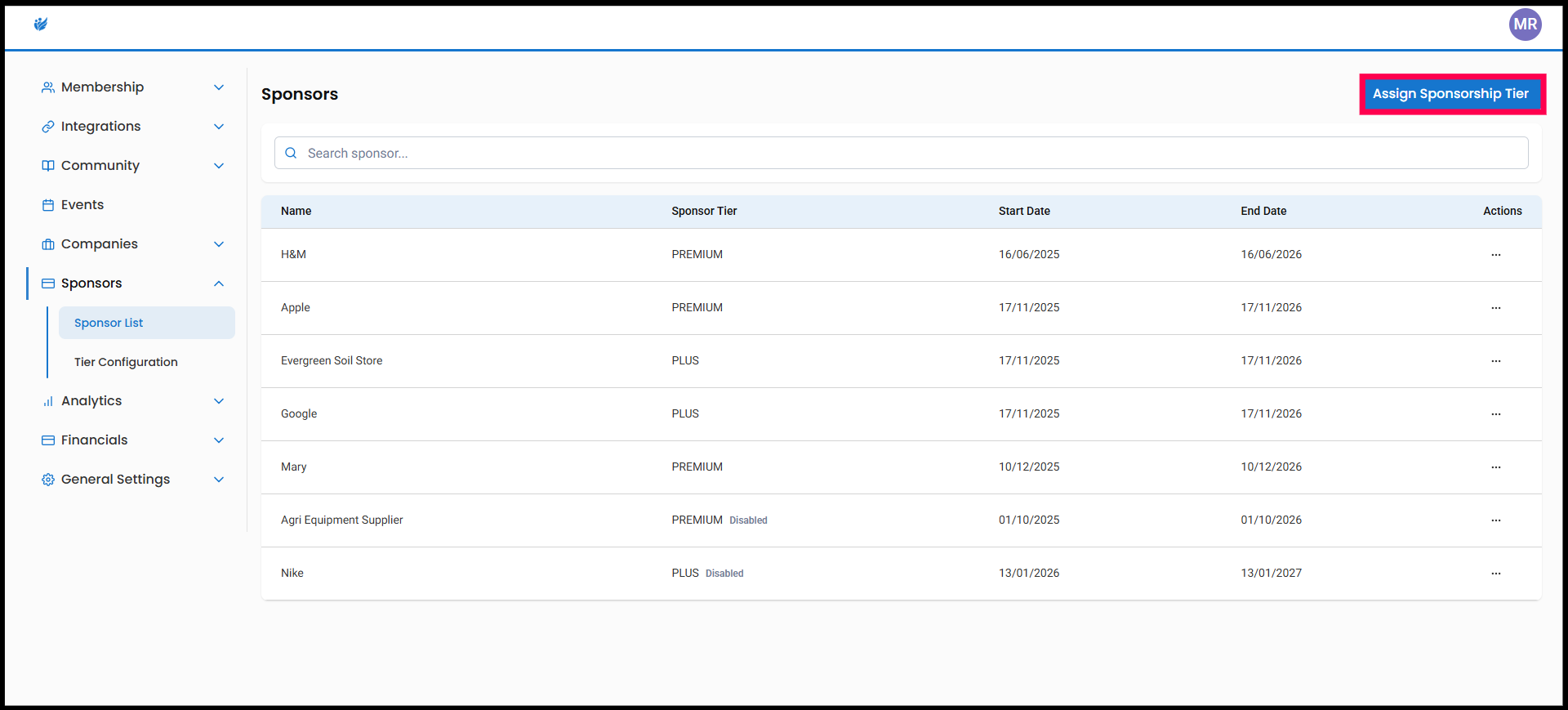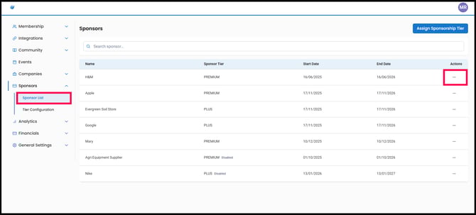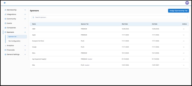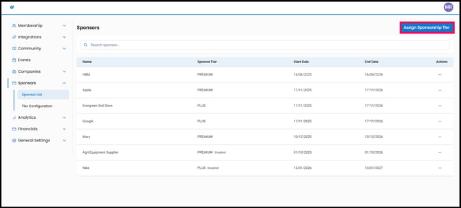 1. Navigate to the Sponsor List, and click Assign Sponsorship Tier.