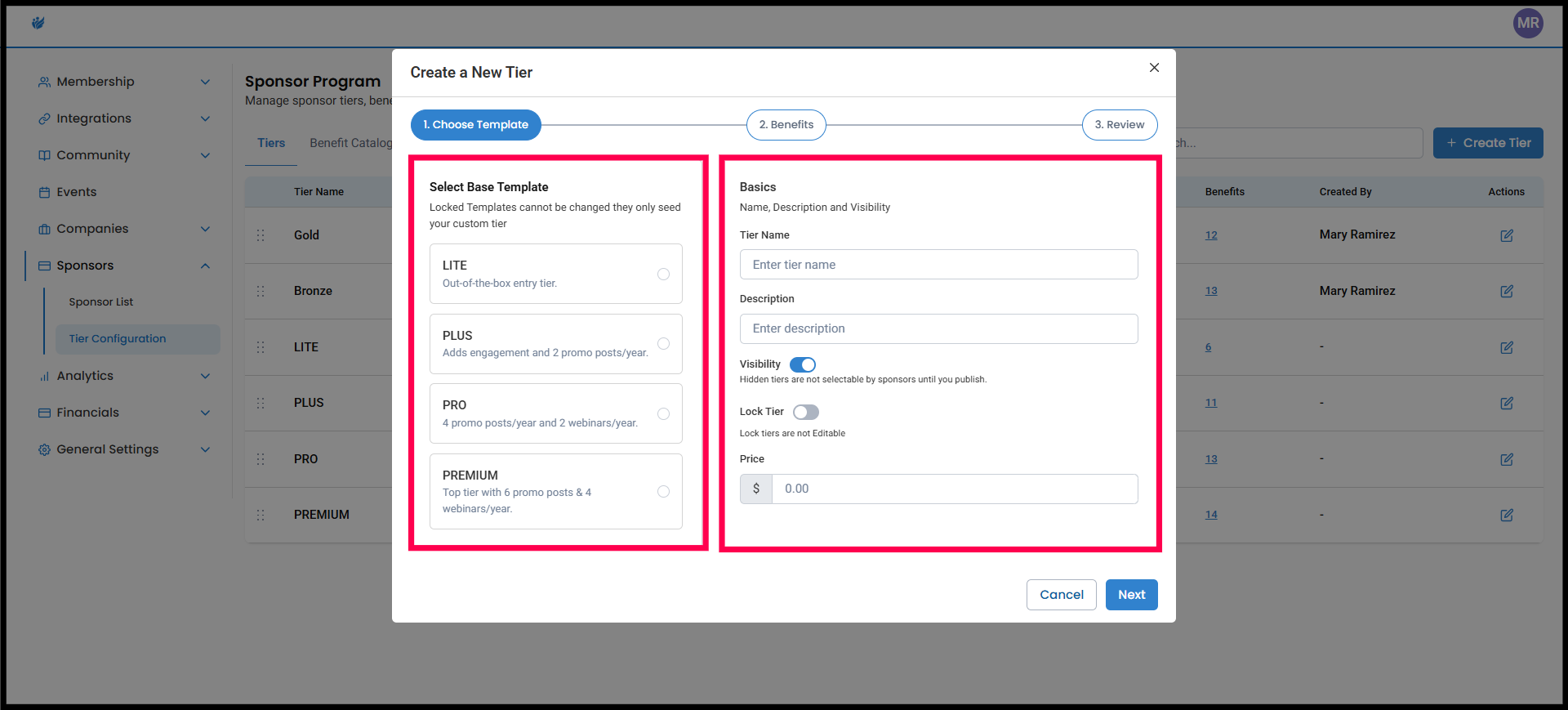 1. Choose a Template + Enter Basics - Go to the Sponsor tab in the admin site, and navigate to the Tier Configuration. Click Create Tier. Then, choose a base template and fill out the following details: