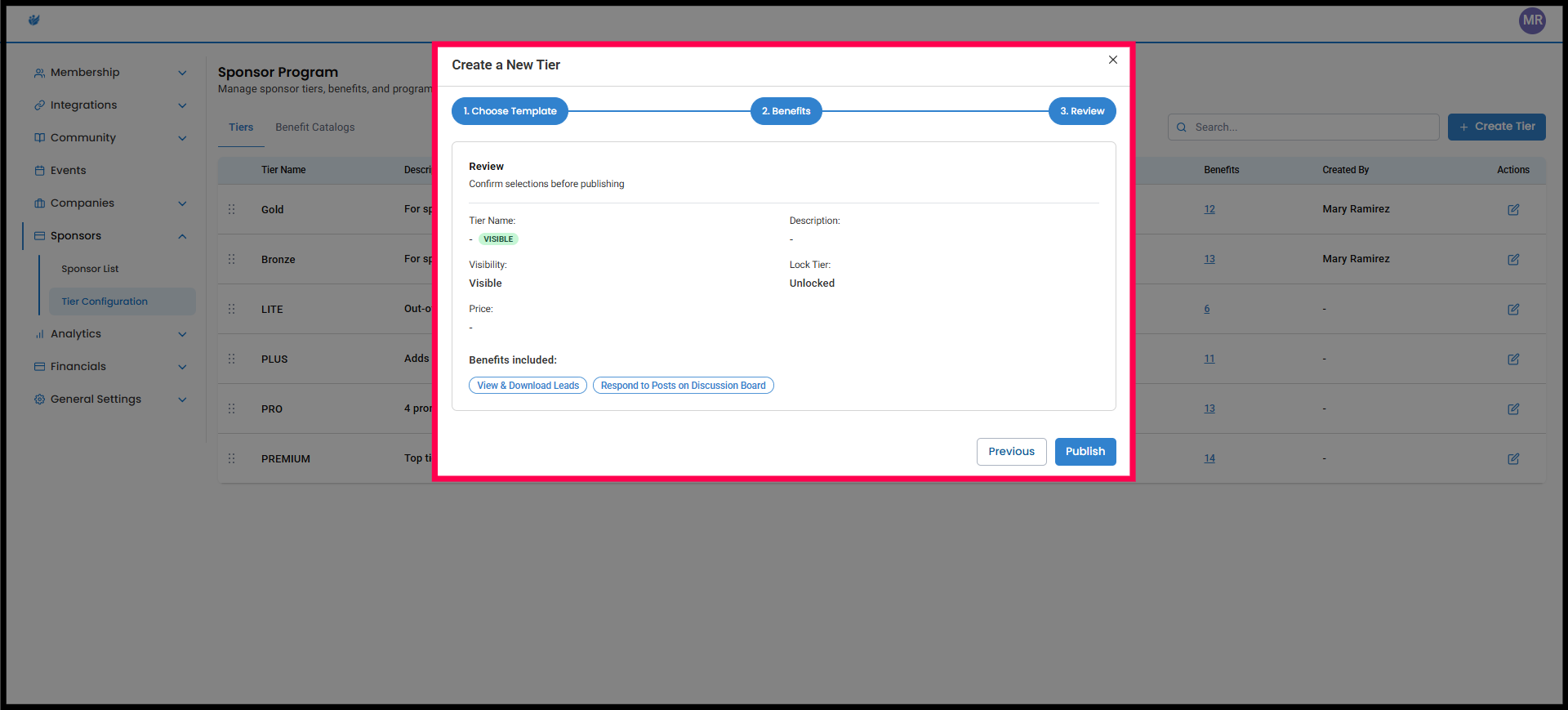 3. Review and Publish - Review the tier details and benefits summary. If you're satisfied with the tier you have created, click Publish. Once published, the tier becomes available for sponsor contracting (unless it’s hidden).