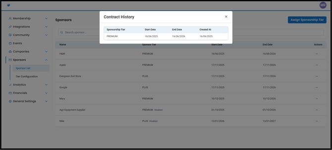 Sponsorship Management helps you define sponsorship tiers (the benefits sponsors receive) and manage sponsor contracts over time—including which tier a sponsor is on, when it applies, and how it changes.