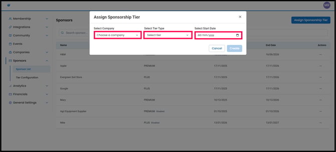 2. From the dropdown, select the sponsor’s company name. Then choose the tier you want to assign and set the contract start date. Set custom start and end date. When everything looks correct, click Create.