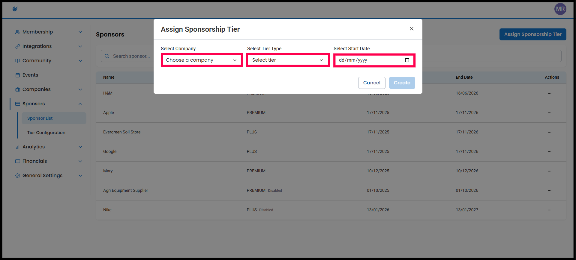 2. From the dropdown, select the sponsor’s company name. Then choose the tier you want to assign and set the contract start date. Sponsor contracts are annual by default. When everything looks correct, click Create.
