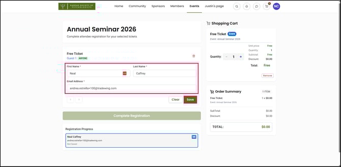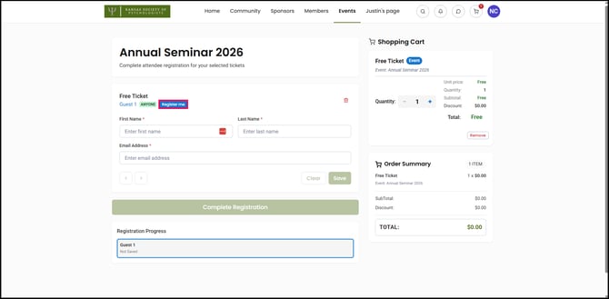 10) To register yourself for a ticket, click Register me. This action will automatically fill the First Name, Last Name, and Email Address fields for you.