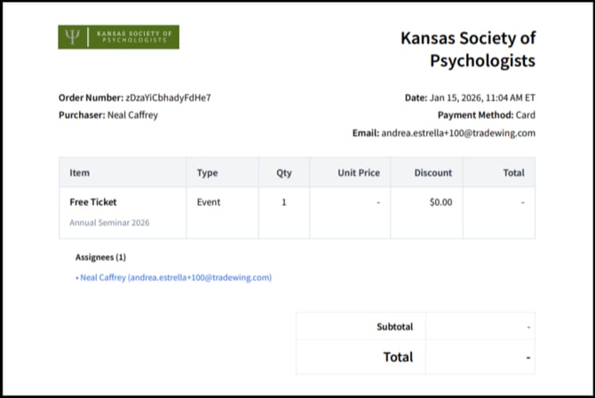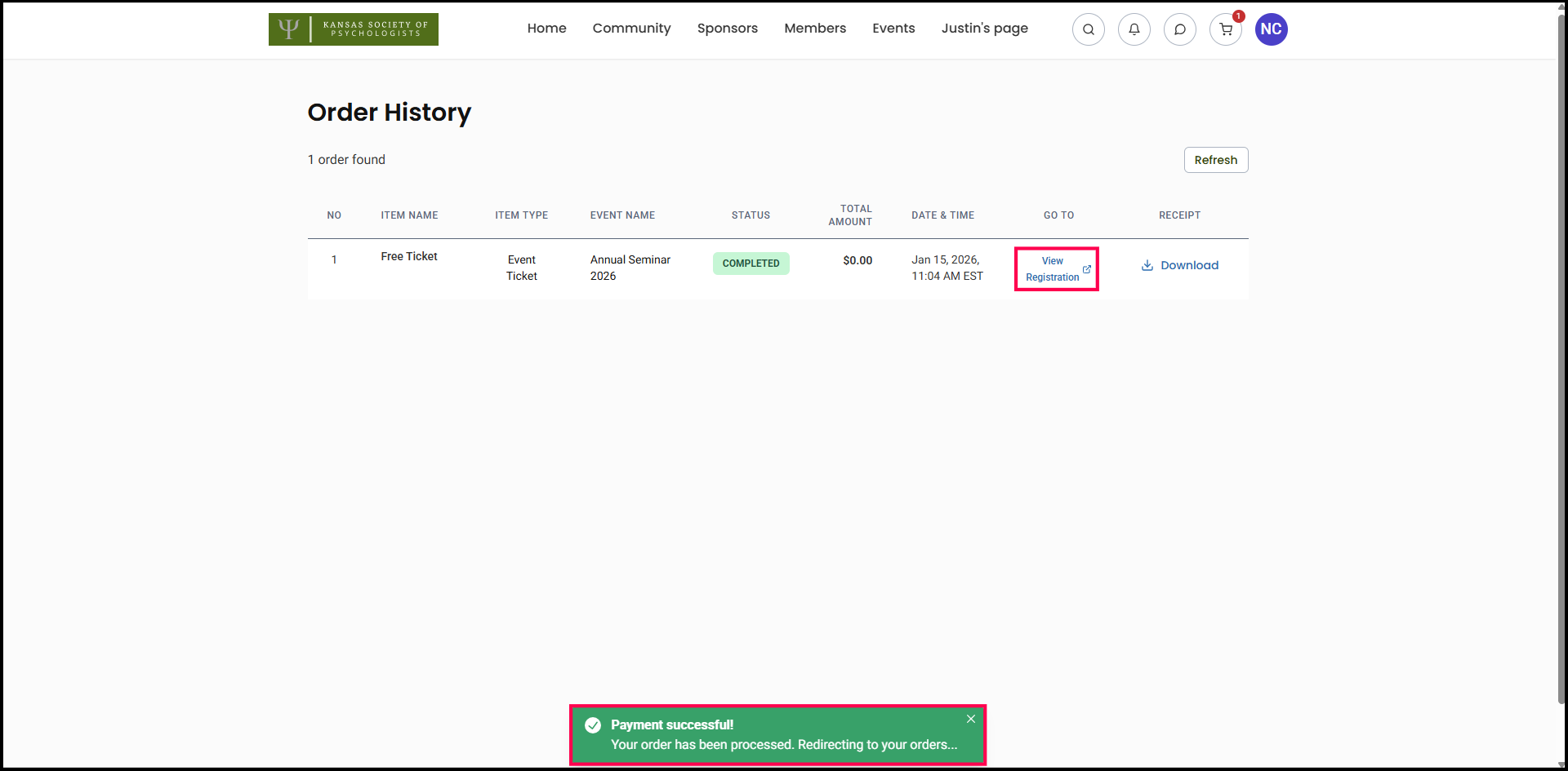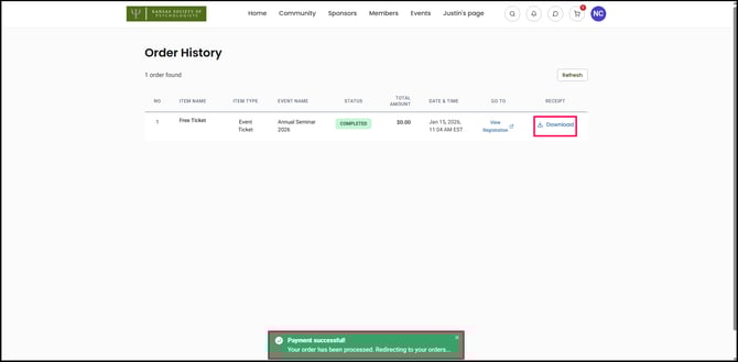 14) You'll be led to your Order History. You can either view your registration for the ticket, or download your receipt. Upon Clicking View Registration, you'll be directed to an overview of all your registrations for the event.
