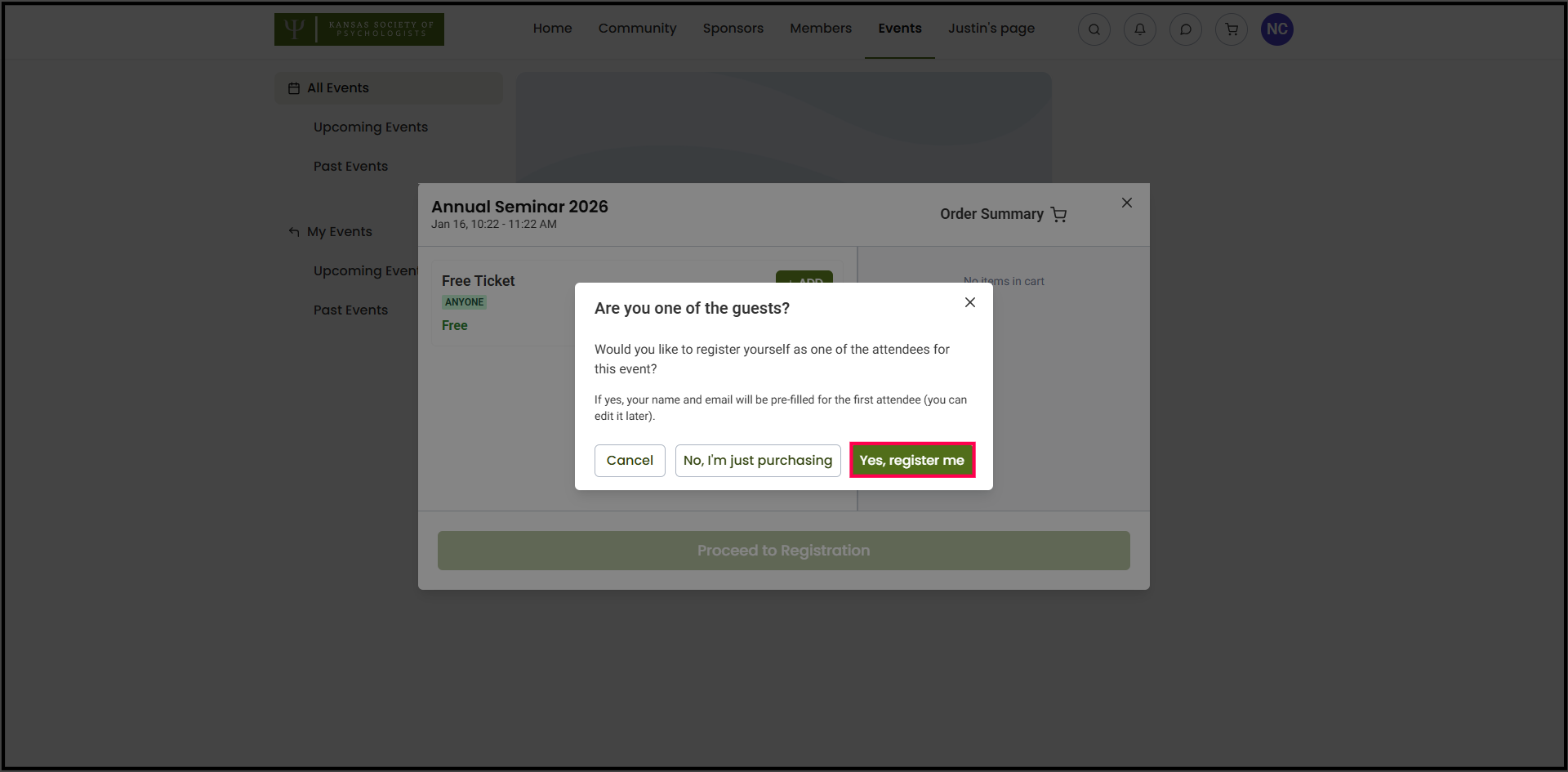 8) Click Yes, register me if you are one of the guests you are registering for the event.