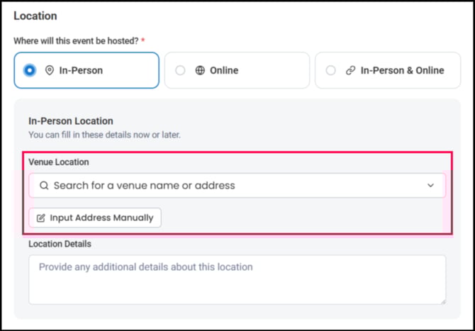 - In-person events require administrators to specify the venue's location where the event will occur. They can also provide essential details, such as room numbers and directions, to assist attendees in finding their way to the venue.