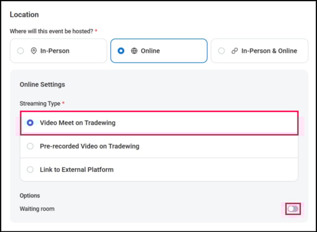 Online events can be hosted through Video Meet on Tradewing, as it is a good way to streamline all aspects of events without needing to use an external platform. To enable the waiting room function, click the toggle button on the lower right.