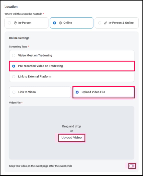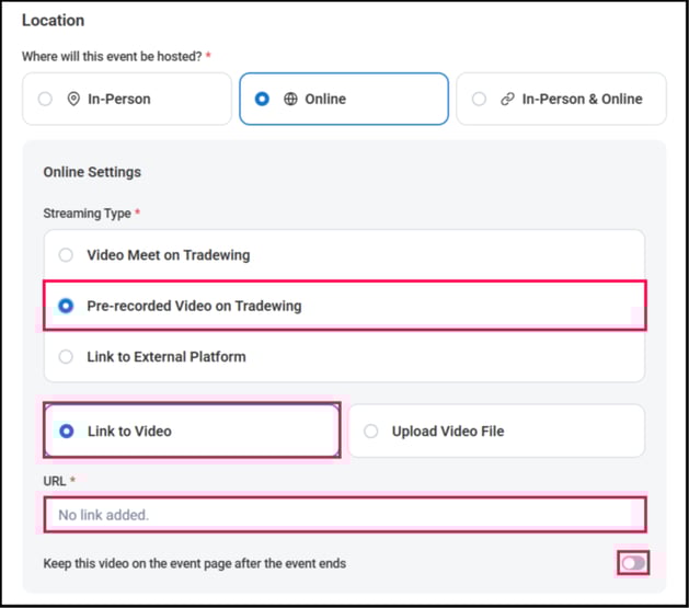 When opting for a pre-recorded video, you have the choice to either link to an existing video or upload a video file directly to Tradewing. If you decide to choose the Link to Video option, you will need to provide a URL where the video is uploaded. This option is commonly used for streaming on platforms such as Youtube, Vimeo, or any other website-hosted video platform. Click the toggle button on the lower right to keep the video on the event page even after the event ends.