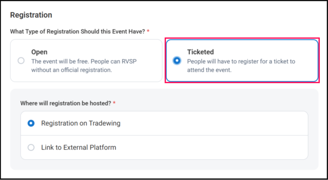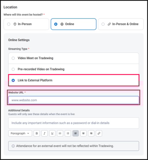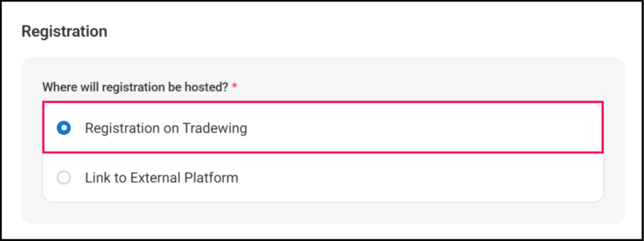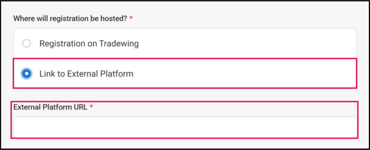Alternatively, if you choose to link to an external platform for ticketing, the registration process will be managed outside of Tradewing. In this case, administrators will need to provide the URL of the external ticketing platform.