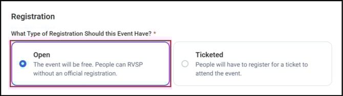 For simple events, you have the option to choose between Open Registration and Ticketed Registration.