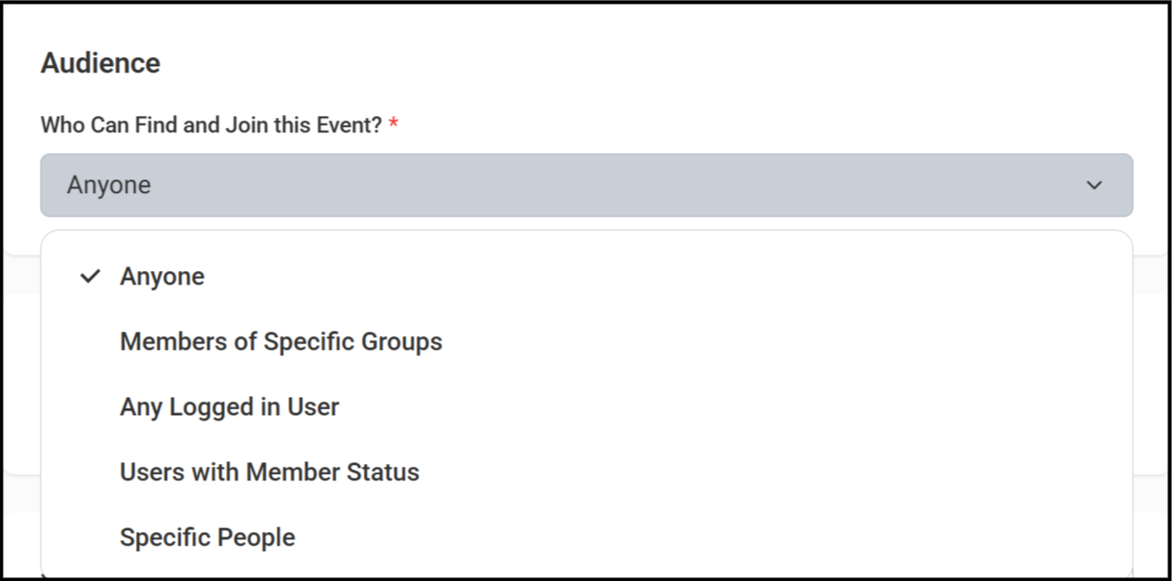 - Anyone refers to individuals who possess the event link, granting them the ability to discover and join the event. This option is ideal if you wish to allow participation from people outside your association.