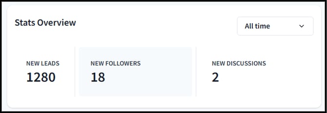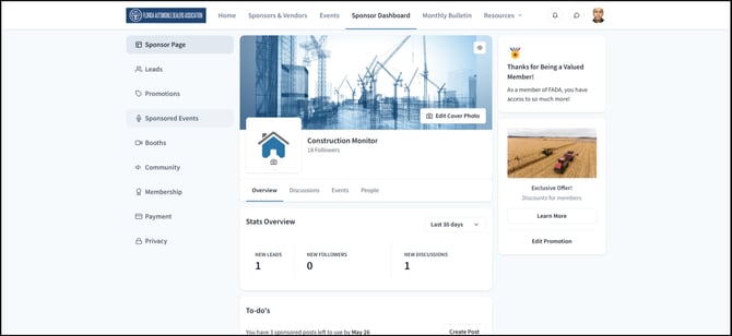 The overview features the leads or people who have interacted with your page. These statistics are visible across all sponsorship tiers. The overview also contains to-do's for the admins, company information, and recent activities in your discussion board.