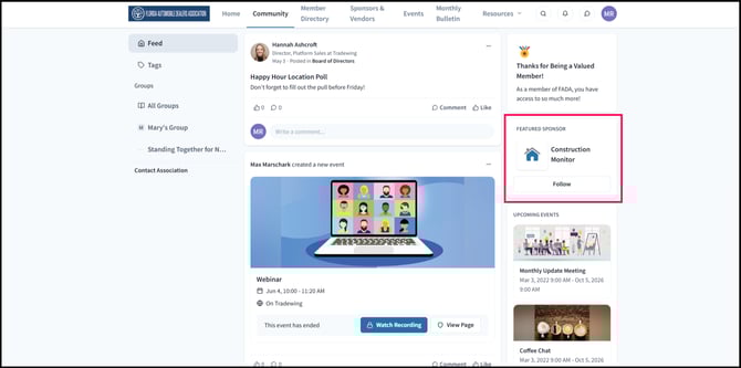 The Sponsor Spotlight feature highlights a different sponsor each day by showcasing their logo, name, and a follow button for members.This feature enables members to explore and connect with different sponsors on their community tab.