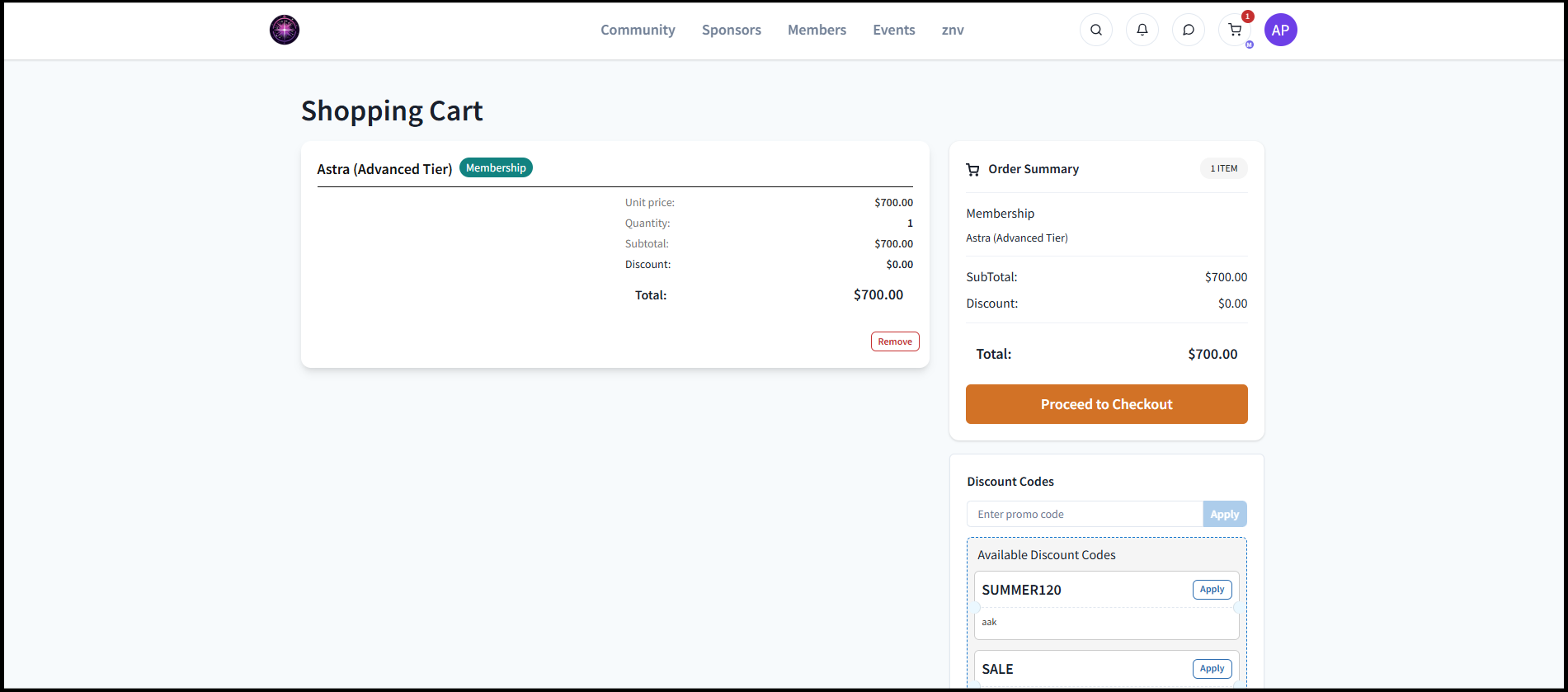 When viewing an event or membership, users select the Add to Cart option. Tickets and products appear in the cart with accurate prices and quantities. When users attempt to purchase a members-only ticket without being an active member, the system presents a message explaining the restriction. If memberships are sold through Tradewing, users may add a membership to their cart to unlock the members-only pricing. - Reviewing the Cart