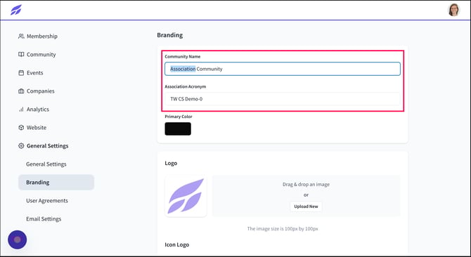 The logo you upload will be displayed prominently in the top left corner of your member site, while the icon logo will appear on the browser tab, contributing to your community's branding.