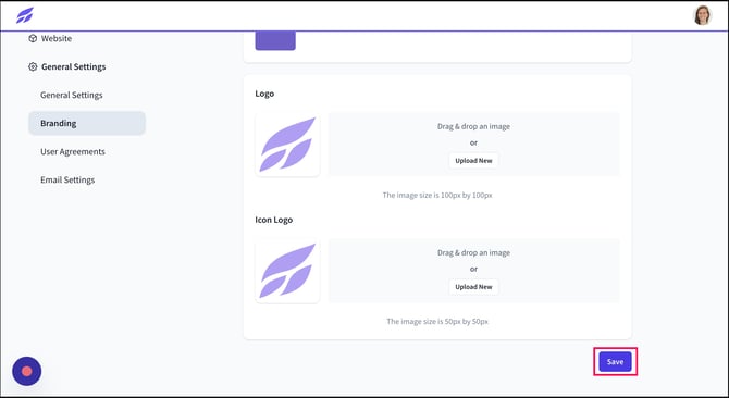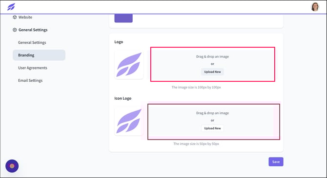 6) To update your Logo and Icon Logo, you have the option to either drag and drop your files or click on the "Upload New" button.