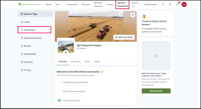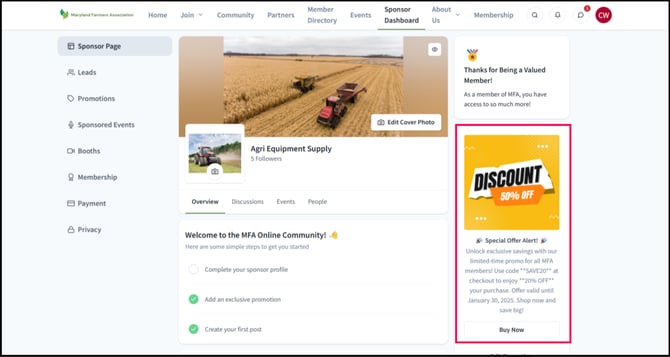 The Sponsor Page Promotion Banner is displayed on the right side of the sponsor's page when members visit. To create this type of promotion page, refer to the steps below:
