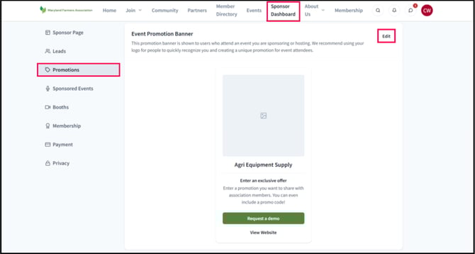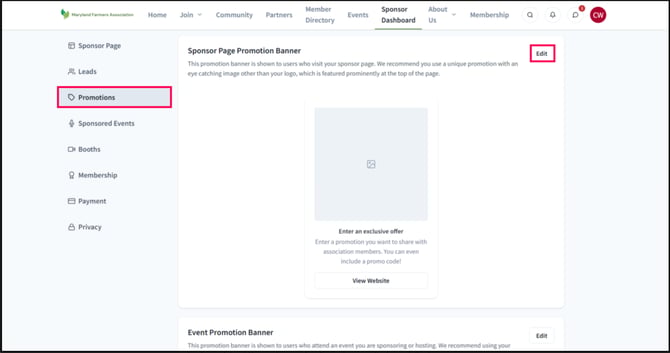 2) Under Promotions, click "Edit" on the Sponsor Page Promotion Banner.