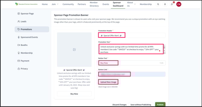 4) Once you have uploaded the images and completed the required fields, you can save it without publishing. This will preview how the promotion banner will appear to viewers before it is officially published.