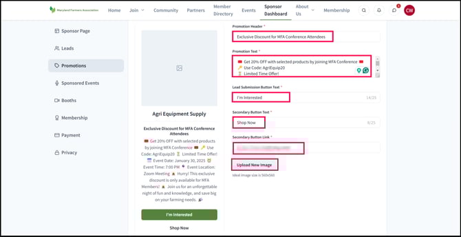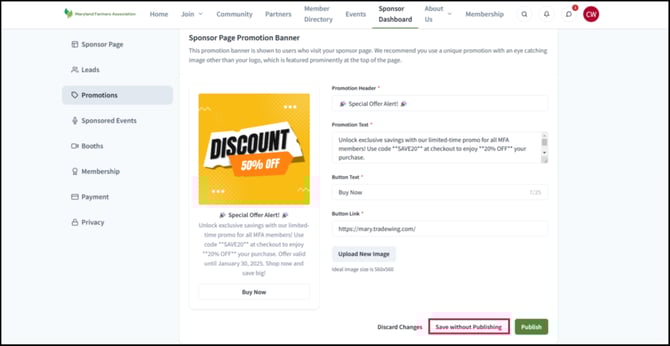 In their dashboards, sponsors can customize how their banners look to association users. Two distinct types of promotion banners are available to sponsors in Tradewing: the Sponsor Page Promotion Banner and the Event Promotion Banner.
