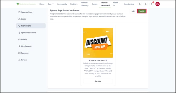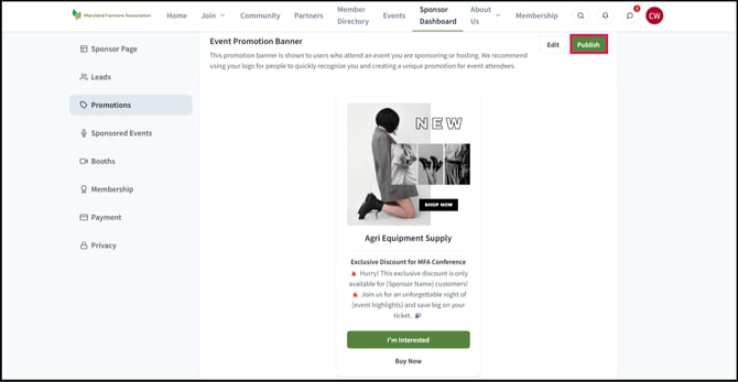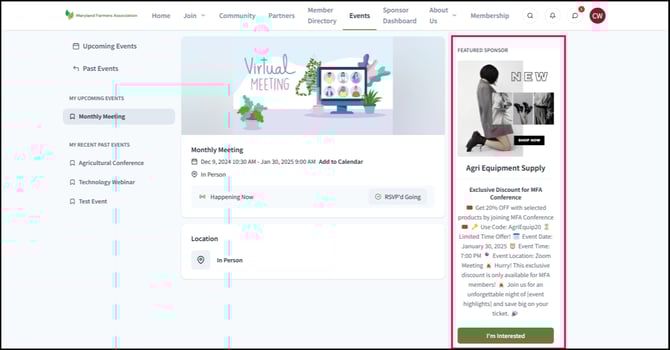The Event Promotion Banner appears on the association's event page when your company is designated as a sponsor for that particular event. This will allow your company to be featured on the event page that attendees can see, increasing your brand's visibility.