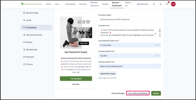 3) After entering all the required information, you have the option to save your changes without publishing. This allows you to preview how the event promotion banner will appear to attendees before making it live.