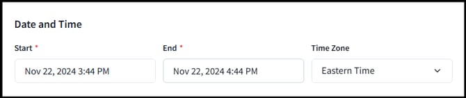 5) Specify the start and end dates for your event, along with the corresponding timezone. The platform will automatically adjust the event time to match each attendee's local timezone once you set it.
