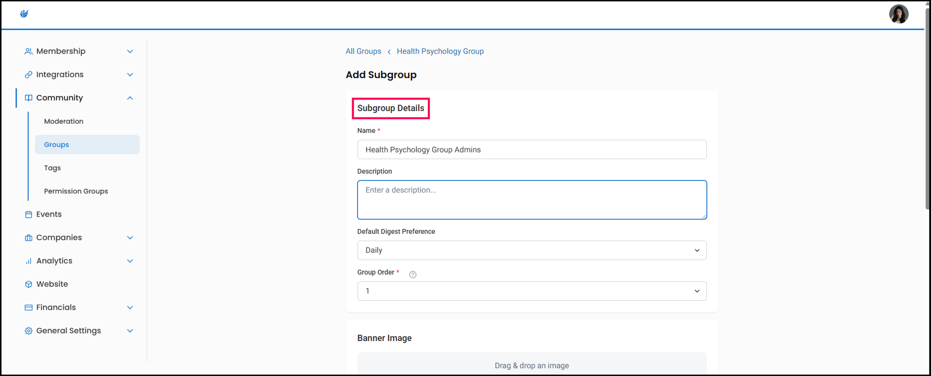 8) If you click, "Create a New Subgroup", you will be prompted to add a name, and have the option to add a description, set the daily digest preference (how frequently the members of this group will receive communications), and arrange it in the All Groups order.