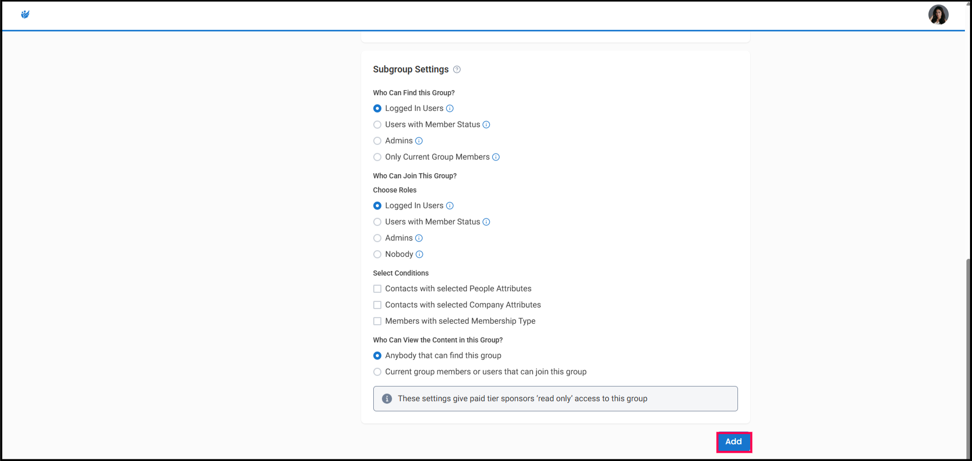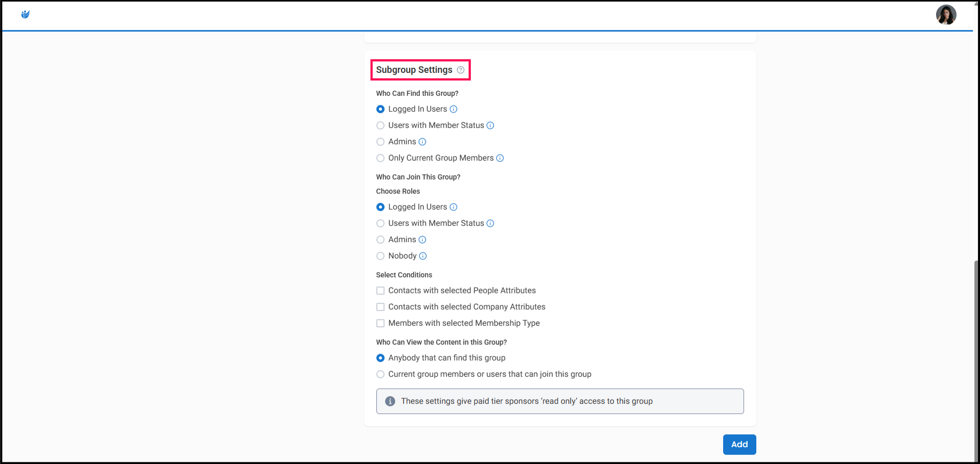 10) Under Subgroup Settings, choose who can find, join, and view content in this group.