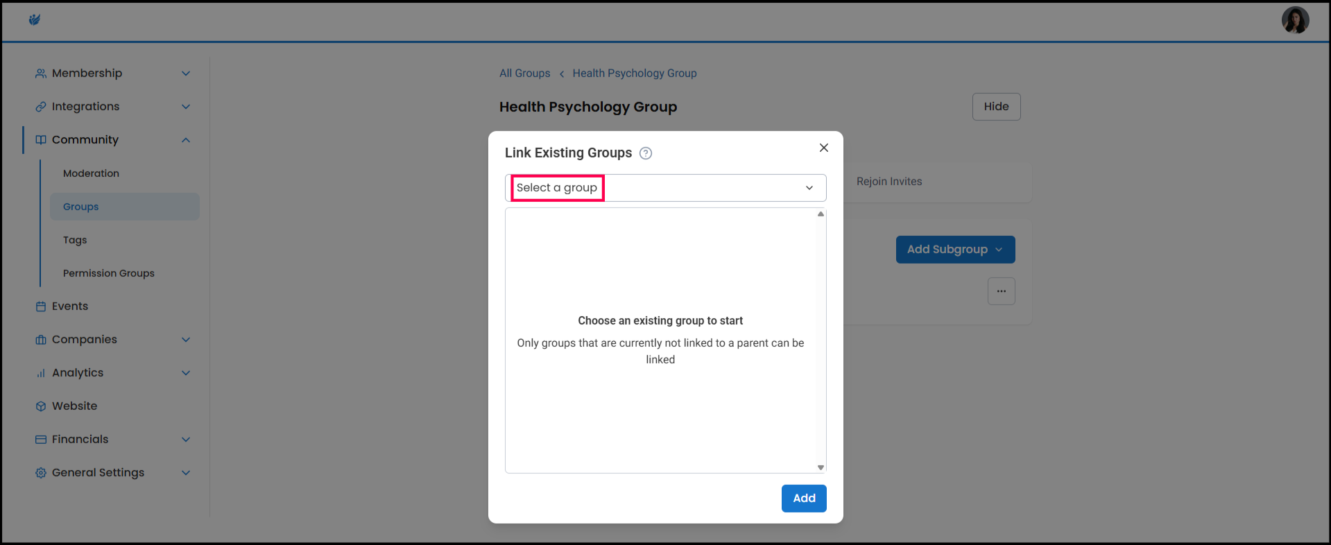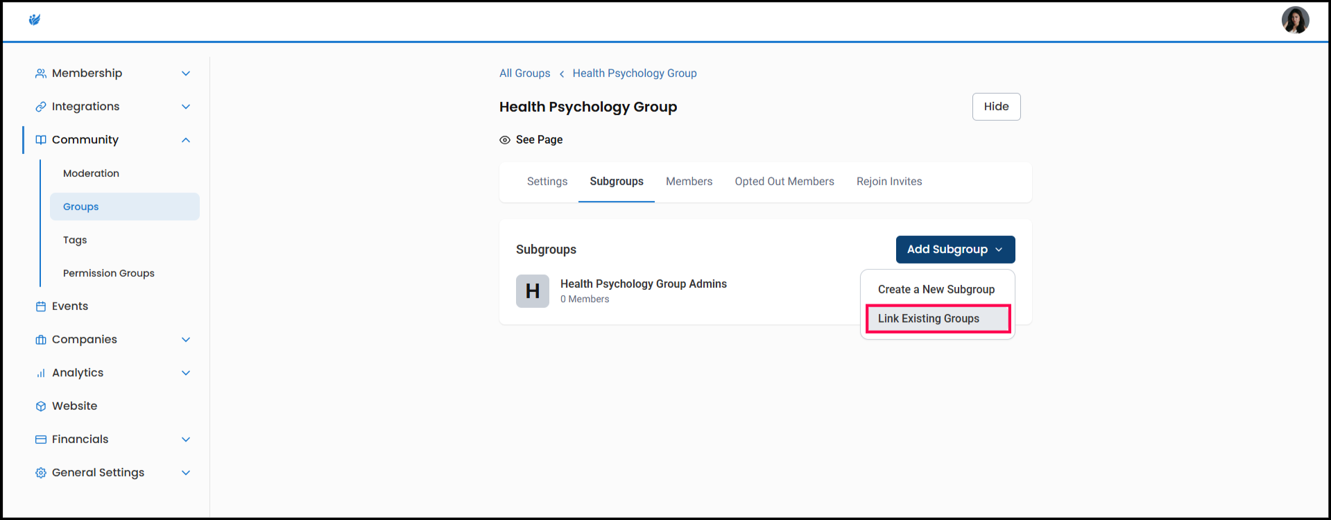 1) To create a subgroup linked to an already existing group, Click "Link Existing Groups"
