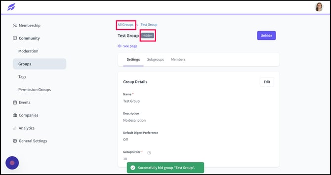 7) You'll notice it now says "Hidden" next to the group name. Click "All Groups" to go back to the groups page in the admin site.