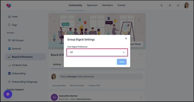 This will allow you to manage how often you want to get an email when another group member posts or comments in the group.