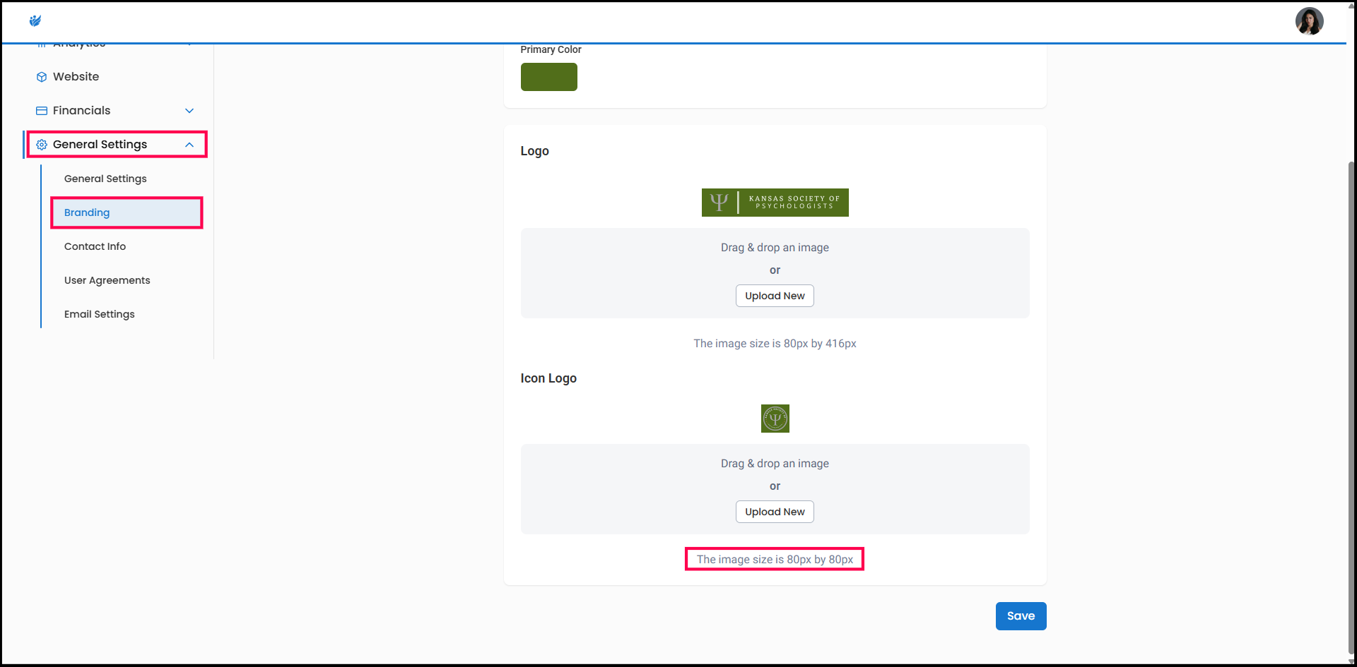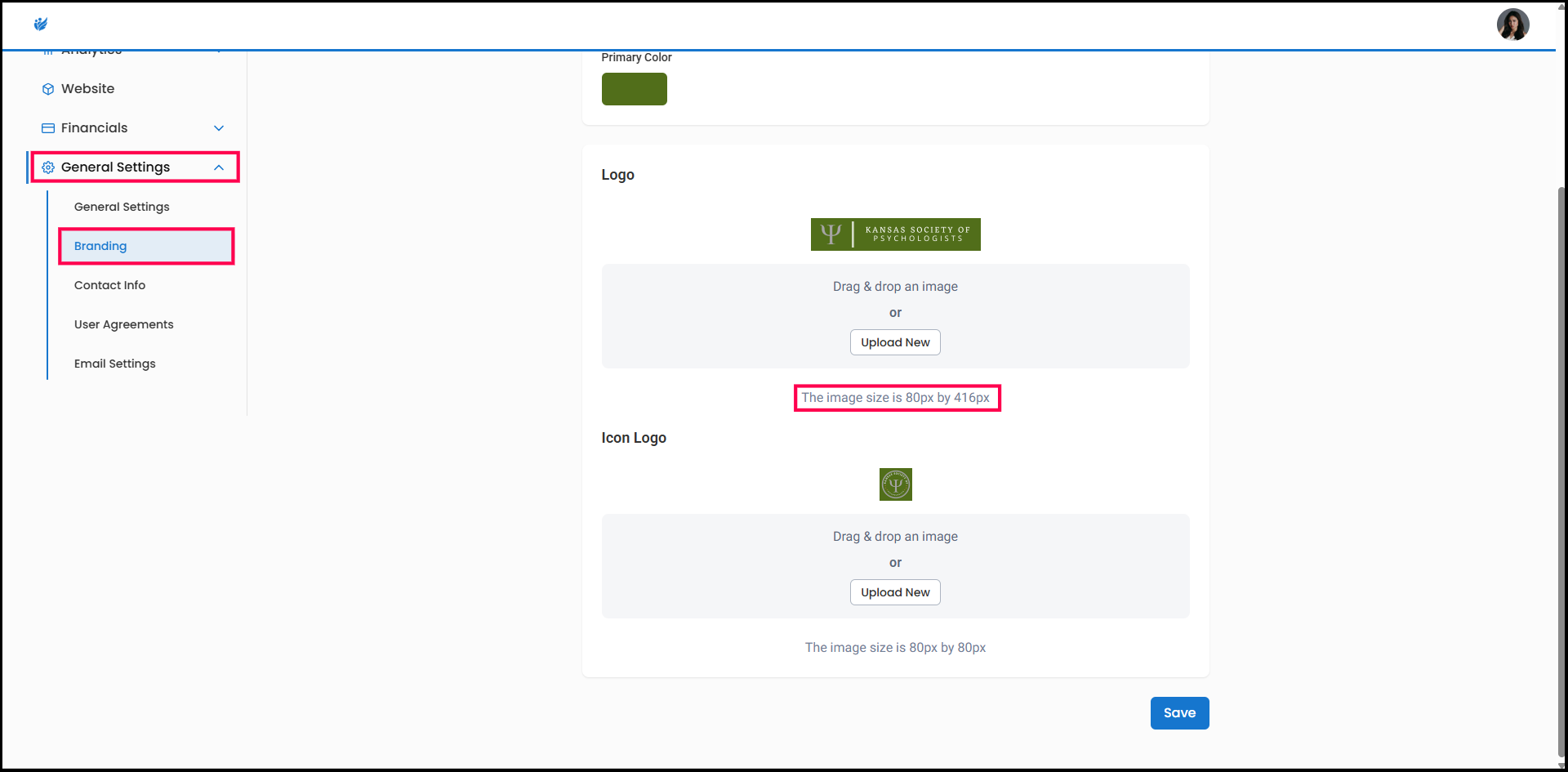 The Icon Logo can be customized in the Admin Site by navigating to the General Settings and choosing the Branding option.