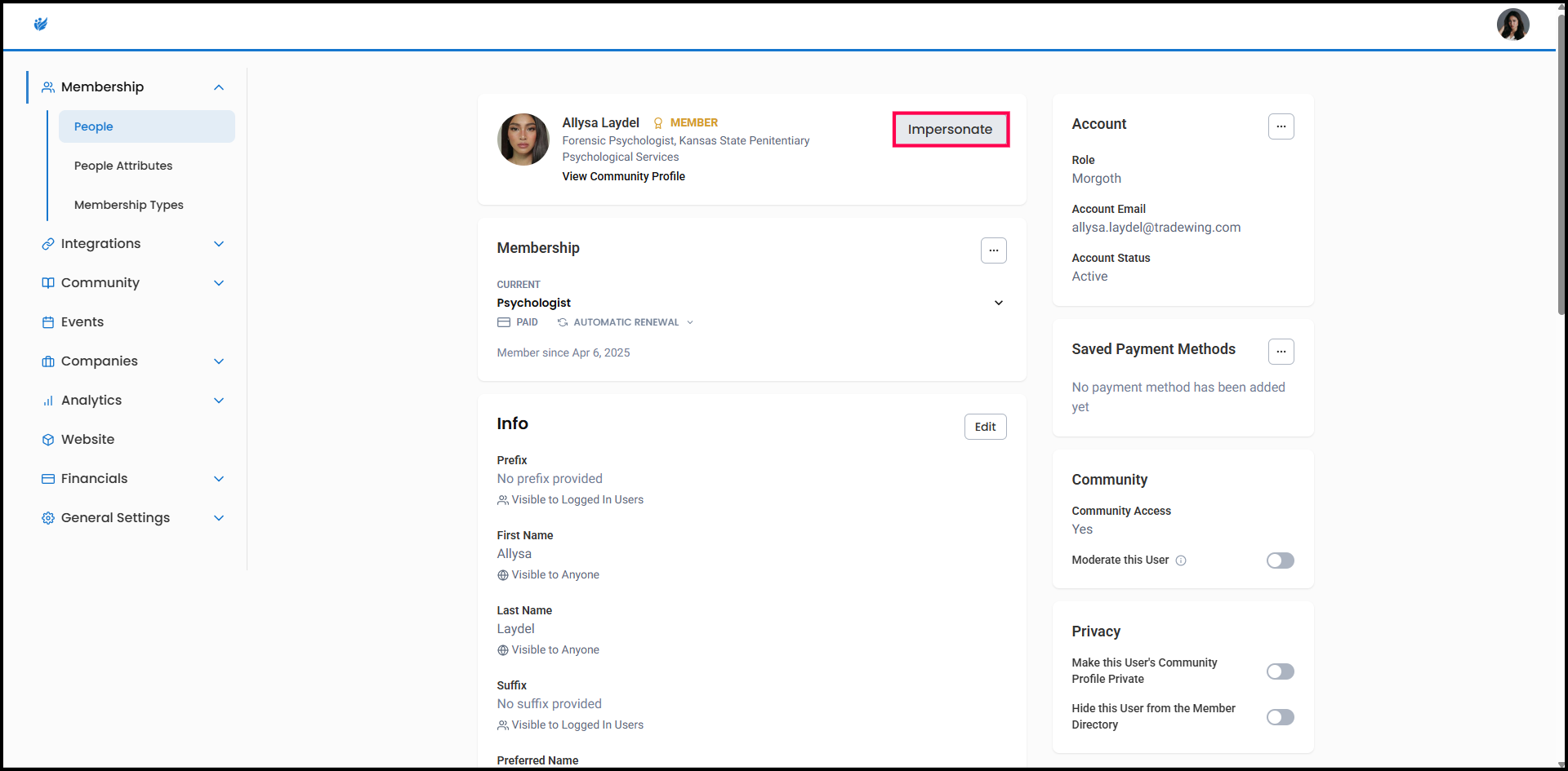 Impersonating a user is a helpful tool in the event that a user is having issues that are better solved by an Admin. Impersonating a user gives you the ability to access a user’s instance of your community. To impersonate a user, navigate to your Tradewing community.