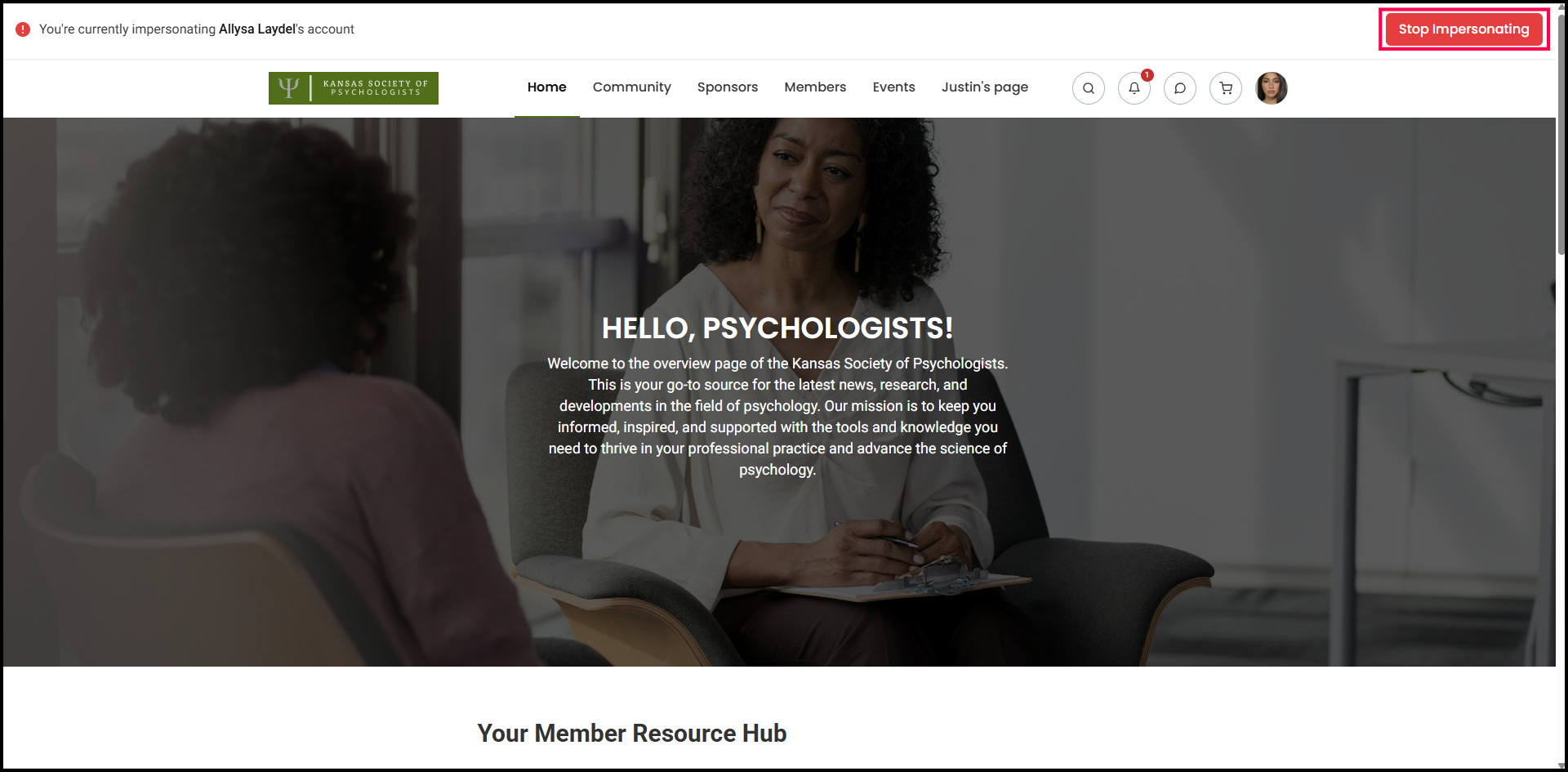 6) Once you begin impersonating the user, all actions taken within the session will be as the user. There will be a banner at the top of the screen to let you know that you are impersonating a specific user. When you are ready to end the impersonation session, click the red Stop Impersonating button at the top of the screen.