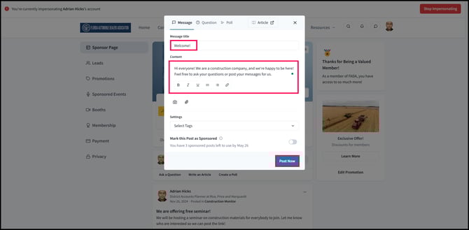 16) We suggest creating a welcome post that users will encounter upon visiting your sponsor page. This not only invites them to explore your discussion board but also encourages them to engage by posting any questions or sharing their insights.