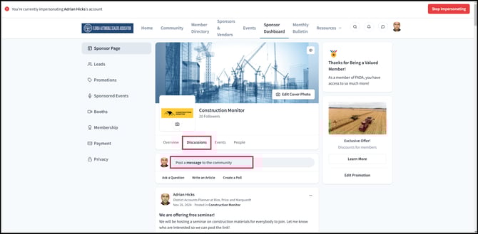 15) Once you have configured the admin settings, you can proceed to create a post on your discussion board. This post will be visible to users when they visit your sponsor page. Select the Discussion tab, then click on the "Post a message in the community" option to share your thoughts.