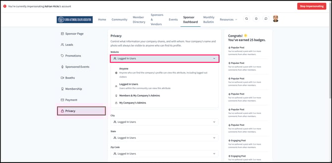6) Navigate to the right side of the screen, and click Privacy. From there, you can change who can see your company's information details.