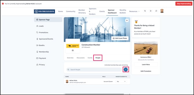 This feature is particularly beneficial for distributing responsibilities and ensuring effective management of your sponsor page. To add a new admin, simply click the blue plus sign icon located under the People tab.