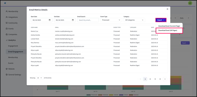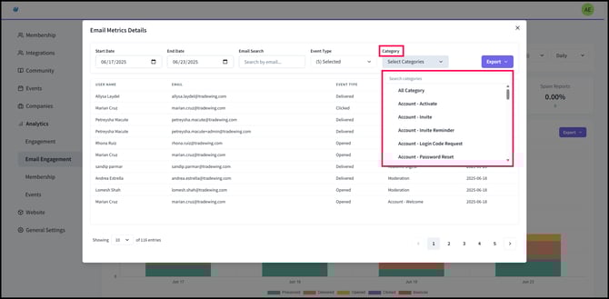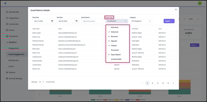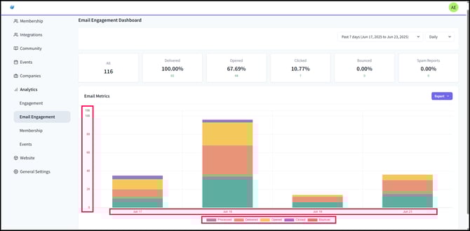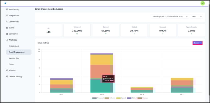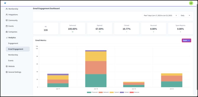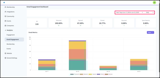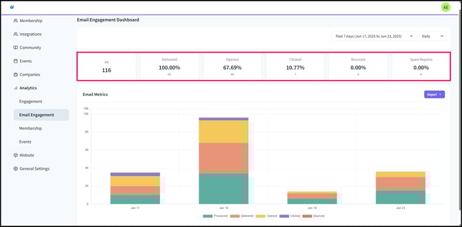 The Email Engagement Dashboard helps you monitor how your community is interacting with your emails—from delivery to open and click-through rates. This view gives you a clear picture of how your messages are performing, so you can optimize your communication strategy.