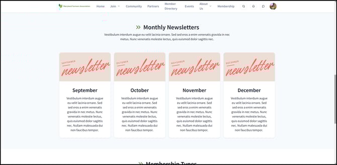 It works great as a main homepage or to highlight key content like newsletters and membership types, using visually engaging cards for easy navigation.